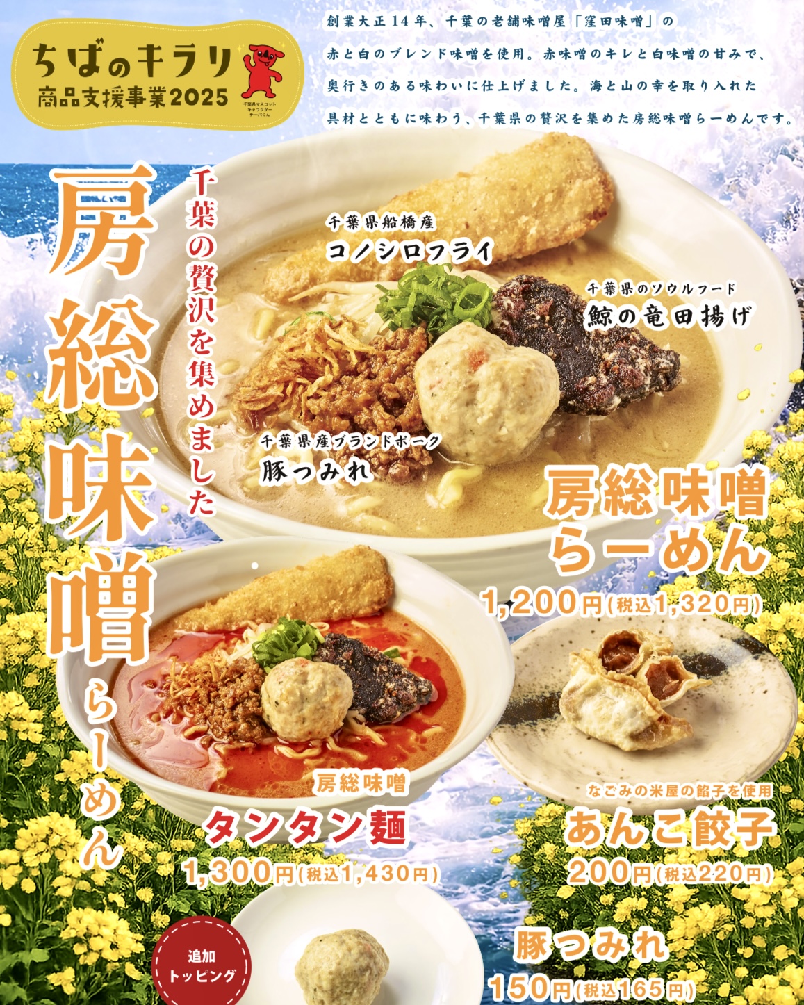 「房総味噌らーめん」「房総味噌タンタン麺」「あんこ餃子」の3商品を開発しました。